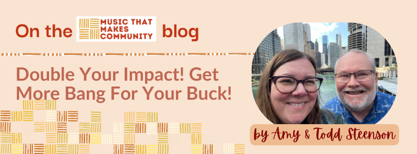 We realized that we can get that same feeling when giving to Music that Makes Community. Todd’s employer, Constellation Energy Corporation, has a “matching gifts” program. Constellation matches employees’ gifts to charitable organizations one-for-one, up to $10,000 per employee. You can even create a gift through payroll deductions that is matched for every pay period. So, we can essentially “buy one and get one free,” and double our impact, every time we donate to Music that Makes Community.